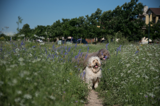 向こうの池ではお散歩のラブが水遊びをしていました